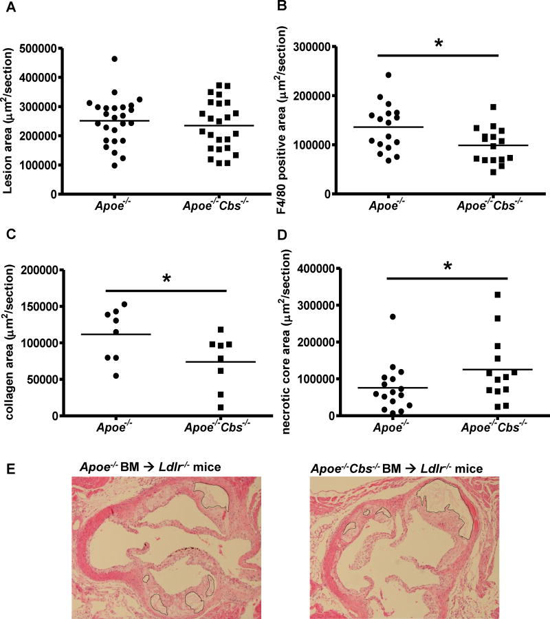 Ldlr-/- mice were transplanted with Apoe-/- or Apoe-/-Cbs-/- BM and fed the WTD for 9 weeks. Hearts were isolated and fixed, and paraffin sections of the aortic root were made. A. Sections were stained with H&E and atherosclerotic lesion area was quantified by morphometric analysis. N=24-25. B. Sections were stained for F4/80 and macrophage-positive area was quantified. N=14-16. C. Sections were stained for Masson-Trichrome and collagen-positive area was quantified. N=8. D. Necrotic core area was quantified on H&E stained sections. N=13-16. E. Representative H&E sections containing necrotic cores are shown. Each datapoint represents a single mouse. *P<0.05, as determined by a Mann-Whitney test.