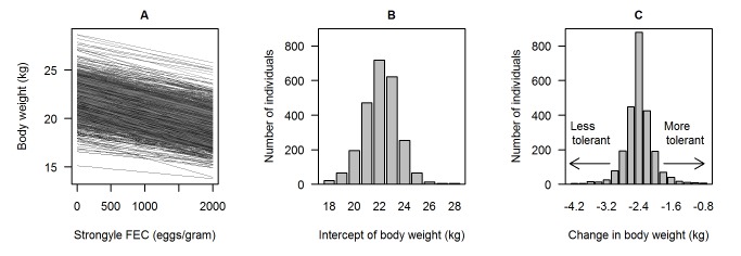 All plots show results of the best-fitting random regression model of tolerance, shown in full in Table 1A. (A) Predicted slopes of the decline in body weight with increasing strongyle FEC for each of the 2,934 individuals in our analyses. Model predictions used for plotting Figure 2A are given in Table S5. Because of the high density of crossing slopes in (A), we also provide (B) a histogram of the distribution of the estimated individual intercepts of body weight (i.e., body weight where FEC = 0) and (C) a histogram of the estimated slopes of individual changes in body weight from 0 to 2,000 eggs/gram of FEC. The most tolerant hosts lose the least weight; the least tolerant lose the most weight. FECs of up to 2,000 represent >98% of the range of parasite burdens experienced by the population. Model estimates used to generate histograms are given in Table S6.