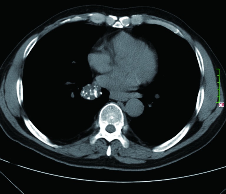 CT shows a case of hamartoma (size: 24 mm) with “popcorn” pattern calcification.
