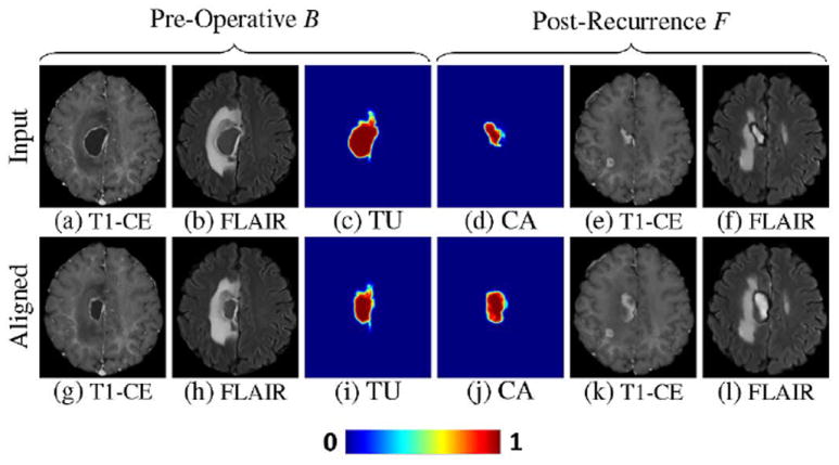 Example of scans and posteriors aligned by Step 3. The upper row shows input scans and their estimated posteriors of (c) tumor and (d) cavity. Posterior of cavity (d) is obtained from the posterior of tumor shown in Fig. 6(h) using (16). Lower row shows the aligned scans and posteriors. Specifically, (g)–(i) are warped from (a)–(c) using and (j)–(l) are warped from (d)–(f) using . Now the tumor nicely matches the cavity region.