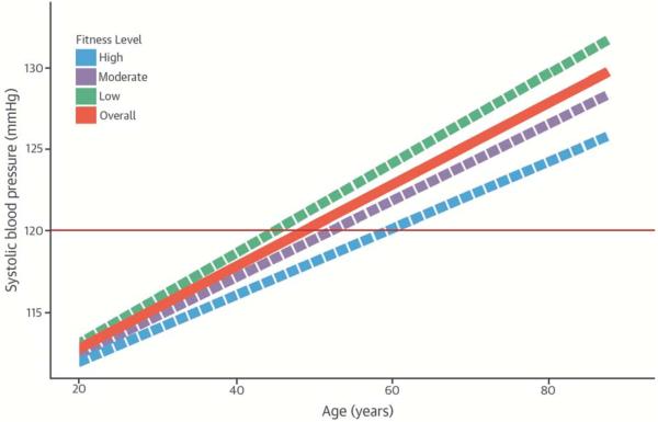 Figure 1. Central Illustration. Systolic Blood Pressure Trajectories With Aging in Healthy Men by Fitness Levels.