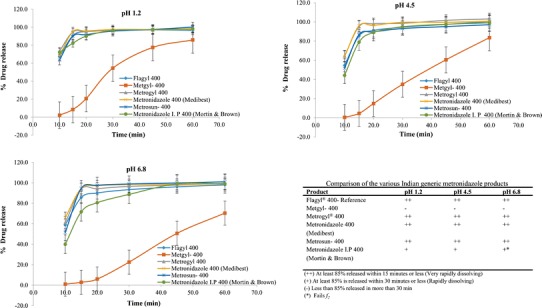 Although Flagyl® 400 manufactured by Sanofi-Aventis (SA) was used as the reference product for this study, Abbott Pharma markets their metronidazole product under the same trade name in India. When the dissolution of both Flagyl® (South Africa) and Flagyl® (India) were tested, both products showed a release of >85% in 15 min in all three media. Hence, the two reference products were shown to be equivalent.