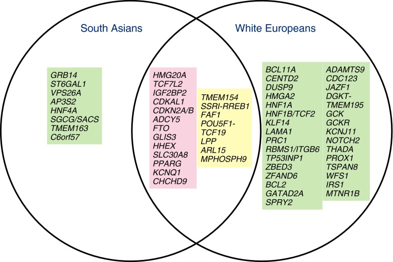 Venn diagram of SNPs common to South Asians and white Europeans and SNPs unique to both groups. CENTD2 is also known as ARAP1. The green box includes genes with GWAS evidence for association with type 2 diabetes; the pink box includes genes with GWAS evidence in white Europeans and association with type 2 diabetes in this meta-analysis; and yellow with genes identified from a trans-ethnic meta-analysis of South Asians and white Europeans [49]