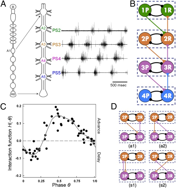 Neuronal circuitry underlying the crayfish swimmeret system. (A) The neural circuit underlying the crayfish swimmeret system consists of a chain of four CPGs located in the abdominal ganglion A2–A5. Each CPG innervates motor neurons that drive the power strokes (PSs) and return strokes (RSs) of a swimmeret. The dissected neural cord in isolation can generate the tail-to-head metachronal wave of neuronal activity as seen in the simultaneous extracellular recordings from the four PS motor nerves, PS2–PS5. (B) Schematic diagram of the neural circuit composed of a chain of four coupled CPGs. Each CPG is modeled as an HCO consisting of two mutually inhibited cells (large circles in diagram) that oscillate in antiphase. Cells in HCOs denoted by iP drive PS motor neurons, and cells denoted by iR drive RS motor neurons (i = 1, 2, 3, and 4). The small solid black circles symbolize inhibitory connections, the small solid triangles symbolize excitatory connections, and the colors indicate the origin of each intersegmental connection. (C) Experimentally measured interaction function H for a crayfish swimmeret CPG. (D) The natural network topology (a1) in the crayfish swimmeret neural circuit and three hypothetical network topologies, (a2), (s1), and (s2), in a chain of four HCOs with nearest-neighbor coupling. Only the middle two HCOs are shown. The small open circles symbolize either excitatory or inhibitory connections.