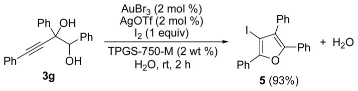 Previous experiments run in D2O have shown that the proton that replaces the gold on the ring derives from the surrounding water, rather than the starting alcohol. If iodine (one equivalent) is present in the reaction of diol 3g, iodinated furan 5 is formed in 93% isolated yield (Scheme 1). With the iodinated furan in hand, it is possible to use it in palladium-catalyzed cross-coupling reactions.12