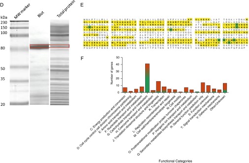 The RSV virion carries only three surface proteins: the attachment (G) protein, the fusion (F) protein, and a small hydrophobic protein. The RSV attachment G protein has been proposed to act as a receptor for pneumococci on infected cells and facilitate bacterial invasion of the cell (32–34). Figure 2A shows that the ability of pneumococcus, detected by ELISA, to bind to immobilized RSV was inhibited by preincubation with anti-RSV G antibodies confirming the ability of the G protein to bind pneumococcus (for a table showing in detail the exact genes that are up-regulated and down-regulated in the transcriptome of S. pneumoniae, see Figure 3). We confirmed this interaction using antigen colocalization and confocal imaging, which showed that RSV G protein directly binds to the surface of the pneumococcus (indicated by the arrowed yellow regions in Figure 2C). Western blotting analysis of a S. pneumoniae membrane lysate showed that RSV G protein bound to a single pneumococcal protein with a molecular weight of approximately 80 kD (Figure 2D). The reactive region of the polyacrylamide gel containing the pneumococcal protein was excised from two separate gels and mass spectrometry detected only pneumococcal penicillin-binding protein 1a (PBP1a) (Figure 2E).
