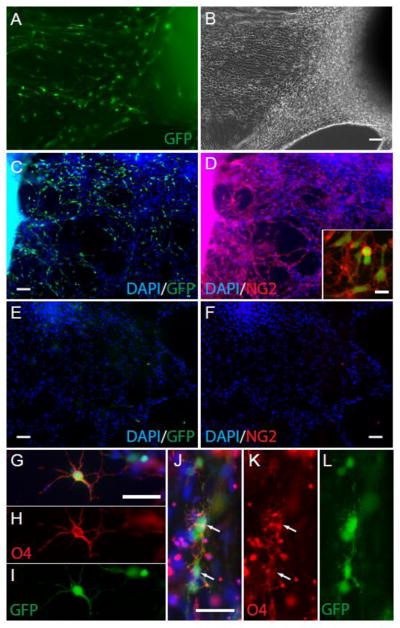 Sox10-MCS5 lentiviral transduced 19-7-7t iPSCs were induced to ventral spinal cord fate as embryoid bodies as described. EBs grown in OPC media were plated onto fibronectin on day 34, grown in PDGF, IGF and NT-3, and imaged at 60 days for GFP expression (A) and phase microscopy (B). Numerous bipolar GFP+ cells were observed migrating from individual EBs. Those EBs containing GFP+ cells were found to contain a high number of NG2-expressing cells (C–D). Almost all GFP+ cells co-expressed NG2 (D, inset). Of note, not all EBs contained GFP positive cells (E) and strikingly in those GFP− EBs we never observed NG2 or O4 staining (F). To encourage oligodendrocyte differentiation, we removed growth factors for 7 days from wells containing GFP+ cells. O4+ immature oligodendrocyte cells (red) were observed in the periphery of GFP+ EBs (G–L). O4+ cells exhibited multi-branched oligodendrocyte-type morphology and almost all co-expressed Sox10-MCS5 reporter GFP. Scale Bars: 100μm in (A–F), 20μm (D, insert), and 50μm in (G–L).
