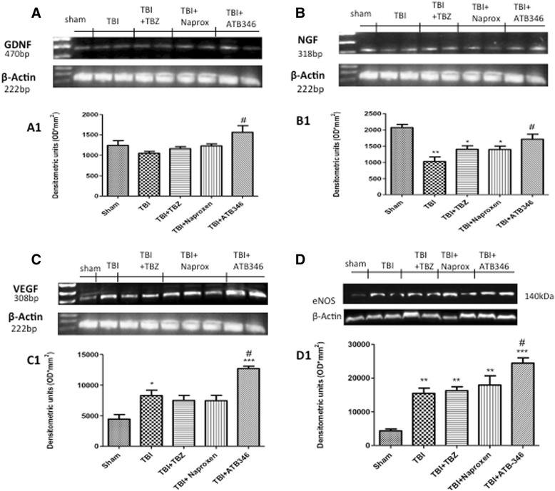 RT–PCR analysis for GDNF , NGF and VEGF (A, B and C, respectively). ATB-346 treatment significantly increased both GDNF and NGF mRNA expression compared to TBI (A and B, respectively). ATB-346 determined an important increase in VEGF mRNA expression (C). β-actin was used as an internal control. mRNA was extracted and reverse-transcribed as described in the Methods section. Similar results were obtained in four additional separate experiments. No bands were observed in the absence of cDNA. Western blot analysis showed that eNOS expression in TBI mice was increased compared with sham mice (D), while ATB-346 upregulated its expression (D). A representative blot of homogenates obtained from five animals per group is shown, and densitometry analysis of all animals is reported (A1 to D1). A P value of less than 0.05 was considered significant. *P < 0.05, **P <0.01, ***P <0.001 versus sham, #P <0.05 versus TBI.