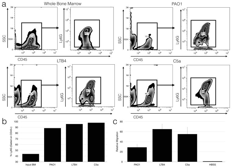 (A) Representative dot plots of whole bone marrow (upper left) used as a source of neutrophils, and of migrated cells after PAO1 infection (upper right) are shown. Cells migrating to LTB4 (lower left) and C5a (lower right) were also analyzed. Cells were initially gated on CD45 to exclude cells of epithelial origin and other debris, then gated on the Ly6G. (B) Percentage of neutrophils among CD45+ cells in the apical chamber following migration to various chemotactic stimuli was calculated. Data represent six pooled individual wells and is representative of three replicate experiments. (C) Relative migration was measured by myeloperoxidase assay, shown as mean ± standard deviation and is representative of at least 3 independent experiments.