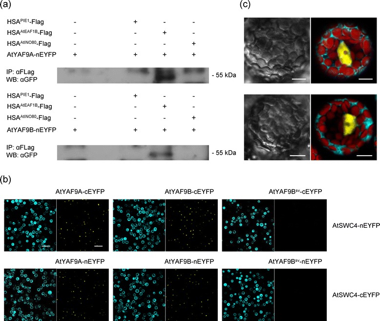 AtYAF9A and AtYAF9B interact with AtSWC4 and the HSA-containing fragment of AtEAF1. (a) Coimmunoprecipitation test of interaction between AtYAF9A and AtYAF9B with the HSA-containing fragments of PIE1, AtEAF1 and AtINO80. Yaf9:nEYFP fusion proteins were detected with antibodies against GFP. Bands above the 55 kDa bars are nonspecific signals from immunoglobulin heavy chains. For additional experimental controls, see Additional file 5. (b) BiFC assay in Arabidopsis mesophyll protoplasts. Each co-transfection consisted of a pair of complementary BiFC constructs (nEYFP and cEYFP fusion, right panels, yellow dots indicate fluorescence complementation in the nuclei) and an ECFP construct as an internal transfection control (left panels, cyan). AtYAF9Bsv is the short splice variant of AtYAF9B, lacking the putative C-terminal SWC4-binding domain. (c) Enlarged images of single protoplasts showing nuclear localization of the EYFP fluorescence, indicating interaction between AtSWC4 and AtYAF9A (upper image) or AtYAF9B (lower image). Chloroplast autofluorescence is shown in red and ECFP fluorescence in cyan. Scale bar: 10 μm. Contrast and brightness were enhanced in all micrographs in (b) and (c) to improve clarity.