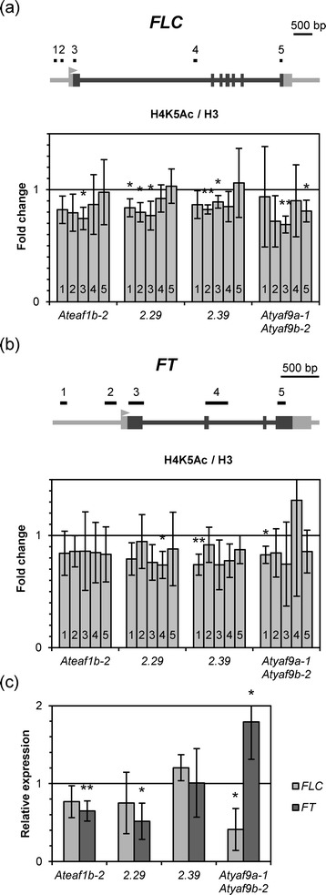 Ateaf1b - 2, Atyaf9a - 1 Atyaf9b - 2 and AtEAF1 - amiRNA lines display reduced H4K5 acetylation but different activity of FLC and FT. (a, b) Acetylation levels in different parts of the FLC and FT genes normalized to H3 presented as fold change over WT Col-0. (c) Expression levels of FLC and FT relative to WT Col-0. Asterisks in (a, b, c) indicate a p-value < 0.05 or p-value < 0.01 (double asterisk) (t-test).