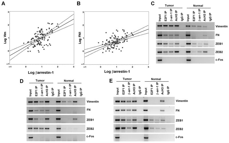 (A and B) Scatter plots showing the correlation of β-arrestin-1 expression with the expression of vimentin and fibronectin from lung tumors of 116 patients. (C–E) ChIP assay performed on NSCLC tumors showed enhanced association of E2F1 and β-arrestin-1 on vimentin, fibronectin, ZEB1 and ZEB2 promoters compared to normal tissues.