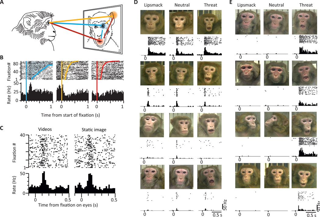 (A–C) Example neurons that increase their firing rate whenever the animal makes a saccade that lands on an eye of a face displayed on a screen. (C) Eye-specific responses can be seen both for dynamic as well as static stimuli. (D) Neuron responsive to the face of a particular individual regardless of facial expression. (E) Cell responsive to a particular emotional expression, regardless of individual. Figures modified from [36, 73].