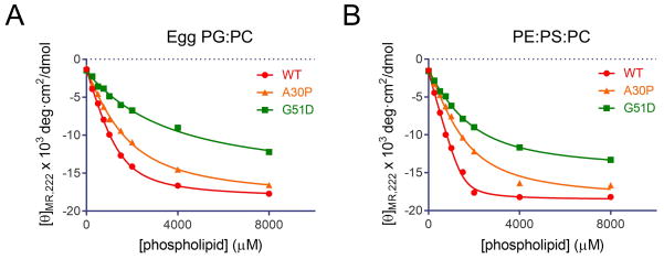 Solutions of recombinant aSyn variants were analyzed by far-UV CD to determine [θ]MR,222, a measure of protein α-helicity. Each aSyn variant was incubated with increasing concentrations of SUVs composed of egg PG:PC (1:1 mol:mol) (A) or DOPE:DOPS:DOPC (5:3:2 w/w/w) (B). The data were fit to equation 2, and values for Kd, minimum [θ]MR,222, and maximum α-helical content were determined from the values of the fit parameters (see Table 1). The data are representative of ≥ 3 experiments (in total, including both lipid compositions).