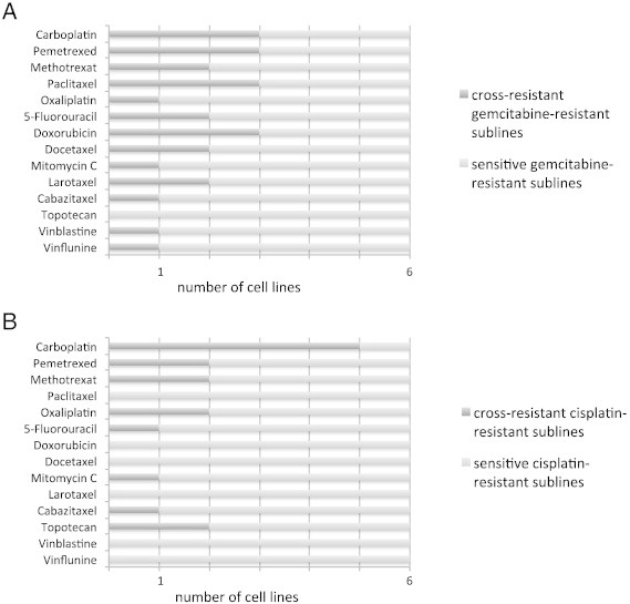 (A) The number of gemcitabine-resistant sublines that displayed cross-resistance to additional anticancer drugs is presented. Cross-resistance was defined as IC50 (as determined by MTT assay) resistant subline/IC50 respective parental cell line > 2. (B) Cisplatin-resistant sublines that displayed cross-resistance to additional anticancer drugs.