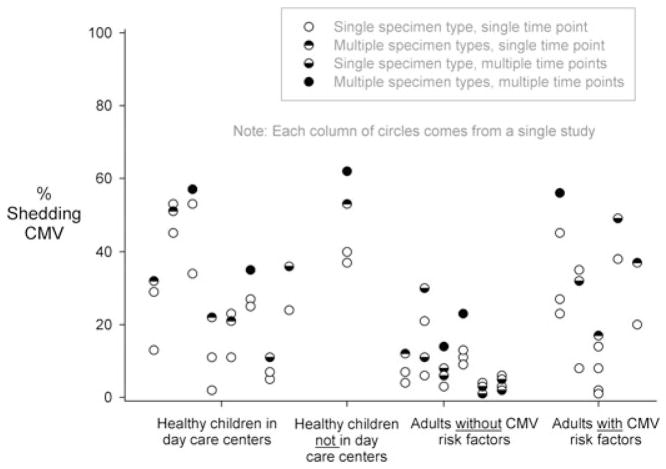 We identified studies of CMV shedding published from 1965 through 2009 by carrying out Medline searches using key words such as ‘cytomegalovirus’ or ‘CMV’ and ‘shedding’, ‘culture’, ‘PCR’, ‘epidemiology’, or ‘prevalence’. Additional studies were identified through the reference lists in the articles we retrieved. Because there are numerous studies on CMV shedding, we limited the scope of the review by excluding studies that primarily focused on congenital CMV birth prevalence, breast feeding, shedding in amniotic fluid, HIV-infected individuals, organ transplant recipients, or assay validation. In general, we also excluded studies of fewer than 25 participants. However, we included all studies regardless of sample size that examined CMV viral load, duration of shedding, or frequency of sequelae in children with congenital CMV, because few studies addressed these topics.