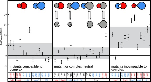 Prediction of binding free energy differences between wild-type ubiquitin and different point mutations (ΔΔGbinding=ΔGbinding,mutant−ΔGbinding,wild-type) calculated using FGTI/CGI. Positive ΔΔGbinding indicates a decrease in binding affinity. Combinations of mutants and binding partners have been divided into three groups. In cases where the mutant stabilizes the state that is compatible to binding (left-most category), a slight increase in binding affinity is expected, but this seems to be too weak to be detected by simulation. The middle section of the graph contains combinations where at least the mutant and/or the binding partner do not prefer one state of ubiquitin. Here, no change in binding free energy is observed, as expected. The right-most section of the graph contains combinations where the population shift caused by the mutation is expected to decrease binding affinity. This is indeed the case for most of the combinations. The gray area gives an indication of the distribution of the data, the middle is the mean, the width is twice the standard deviation. The error bars represent the uncertainty of the values estimated using bootstrapping.