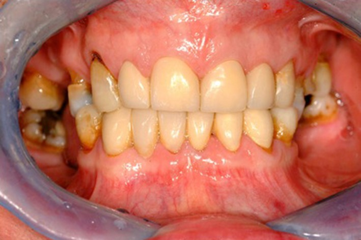 In order to establish occlusal holding stops, the laboratory made matrices were used to provide direct composites on 17, 13, 23, 27, 34, 43, 44 at the increased OVD planned on the diagnostic wax up. The 22 was prepared for a post and core. On a subsequent visit, the 22 post and core was fitted and the 12, 11, 21, 22, 32, 31, 41 prepared for metal ceramic crowns. The 43 was prepared for a fixed metal ceramic cantilever bridge to replace the 42. Maxillary and mandibular full arch addition cured silicone impressions, facebow and interocclusal records were made. Subsequently, anterior laboratory made provisional crowns were fitted (Fig. 6). The occlusion was checked and RCP and ICP were coincident and only minor adjustments were made to the occlusion. After a period of 2 months, the final metal ceramic crowns were cemented on the 12, 11, 21, 22, 33, 32, 31, 41, 42, 43 using Rely X™ (Dental Cement Products, 3 M ESPE Dental Products). Metal ceramic crown preparations were carried out on the 24, 25 and the crowns were subsequently fitted.