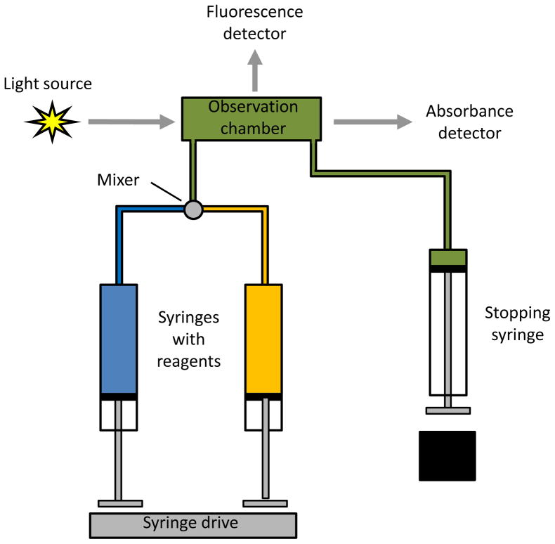 In this technique, a small volume of each desired reagent is rapidly applied by a device such as a syringe and passed through a mixer to initiate the reaction (see Fig. 1). This mixture is then moved into an observation chamber, and the flow is stopped. Data acquisition of a signal that is produced by one of the components in the observation chamber is begun at this time. The time interval between the mixing of the reagents and the beginning of signal observation is usually only 1–2 ms and is referred to as the “dead time” [21,24].