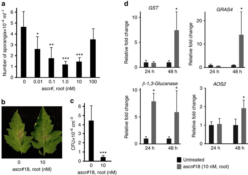 (a) Dose dependence of enhanced resistance to Phytophthora infestans (US22) in leaves of tomato cv. M82 root pretreated with ascr#18 for 48 h before inoculation. Sporangia numbers were count at 6 d.p.i. to assess disease severity. Data are average±s.d. (n=16). (b) Blighted area caused by P. infestans in tomato cv. M82 leaves photographed at 6 d.p.i. (c) Enhanced resistance to Pst DC3000 in tomato cv. M82 root pretreated with ascr#18 for 48 h. Bacterial growth was assayed at 4 d.p.i. Data are average±s.d. (n=6). (d) Induction of defense-response genes in tomato leaves 24 and 48 h after root pretreatment with ascr#18 (see Fig. 2e legend for details). Data are average±s.d. (n=3). *P≤0.05; **P≤0.005; ***P≤0.0005, two-tailed t-test.