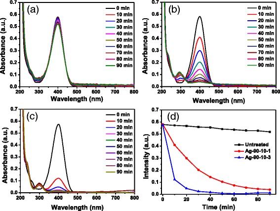 Evolution of UV-vis absorption spectra of 4-nitrophenol solution with a untreated ramie fibers, b Ag-90-10-1, and c Ag-90-10-3 after NaBH4 solution was added. d Plots of corresponding band intensity at 400 nm as a function of reaction time