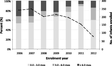 Temporal changes in infant enrollment for PMTCT care at a rural HIV clinic in Kenya. Dashed line: infants enrolled each year. Light grey, mid-grey and dark-grey bars represent age at enrollment: enrolled before 3 months, between 3 to 6 months and after 6 months of age respectively. The total number of infants enrolled (n = 1338). PMTCT; Prevention of Mother to Child HIV-1 Transmission