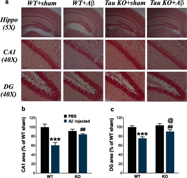 Aβ injection reduces hippocampal neuronal area (Nissl staining) of 3-month-old wild-type (WT) but not tau knockout (KO) mice. (a) Representative images of the hippocampus (Hippo), CA1 region, and dentate gyrus (DG) region from treated mice. Scale bars: 250 μm for 5×, and 50 μm for 40×. (b, c) Quantification of neuronal area in (b) CA1 and (c) DG regions. n [WT, phosphate-buffered saline (PBS)] = 6; n (WT, Aβ) = 7; n (tau knockout, PBS) = 5; n (tau knockout, Aβ) = 7. ***p < 0.001 versus sham-injected WT mice; ## p < 0.01 versus Aβ-injected WT mice; @ p < 0.05 versus sham-injected tau KOT mice . Data are means ± SEM