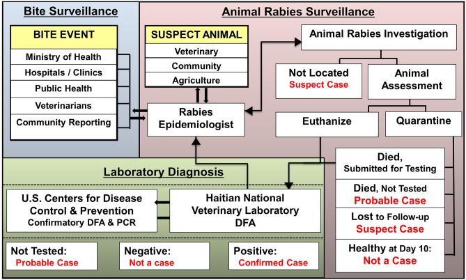 Fig 1. Haiti Animal Rabies Surveillance Program structure for reporting, investigation, and diagnostic testing of rabies suspect animals.
