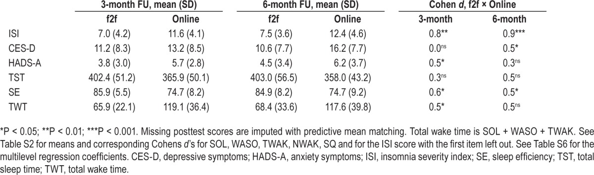 At post-assessment, the online (Cohen d = 1.2) and face-to-face (Cohen d = 2.3) intervention groups showed significantly larger treatment effects than the wait-list group on insomnia severity (insomnia severity index). Large treatment effects were also found for the sleep diary estimates (except for total sleep time), and anxiety and depression measures (for depression only in the face-to-face condition). Face-to-face treatment yielded a statistically larger treatment effect (Cohen d = 0.9) on insomnia severity than the online condition at all time points. In addition, a moderate differential effect size favoring face-to-face treatment emerged at the 3- and 6-mo follow-up on all sleep diary estimates. Face-to-face treatment further outperformed online treatment on depression and anxiety outcomes.