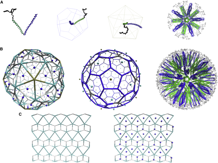 Geometric principles underlying the symmetric locations of SAPN. (A) The monomeric building block of the SAPN, containing trimeric (blue) and pentameric (green) oligomerization domains, is shown positioned with reference to a dodecahedron (with vertices on icosahedral threefold axes) and icosahedron (with vertices on icosahedral fivefold axes), and as a 60-chain assembly with icosahedral symmetry. (B) A 360-chain SAPN is shown in comparison with the all-pentamer scaffold used in viral tiling theory to model the surface structure of polyomavirus, where five-coordinated vertices in the tiling mark the centers of the fivefold protein clusters. Putative trimer locations of the SAPN are superimposed as blue dots, given by the central positions of three triangulated pentameric vertices. The 12 icosahedral fivefold symmetry axes are shown in gold, while the pentameric vertices proposed by viral tiling theory are in cyan. The middle image demonstrates that the trimeric locations are equivalent to the vertices of a T = 7d icosadeltahedral particle in Caspar-Klug theory. The 20 icosahedral threefold symmetry axes are shown in gray, while the trimeric vertices proposed by Caspar and Klug are in blue. (C) Adaptation of Twarock’s tiling model for tubular assemblies of viral capsid proteins with all-pentamer clusters. In the virus model, pentamers are positioned at the five-coordinated vertices; in the case of a SAPN particle, threefold clusters occur in addition at the positions marked as blue dots. Amino acid sequence of the SAPN species: MGHHHHHHGDWKWDGGLVPRGSDEMLRELQETNAALQDVRELLRQQVRQITFLRALLMGGRLLARLEELERRLEELERRLEELERAINTVDLELAALRRRLEELAR. To see this figure in color, go online.
