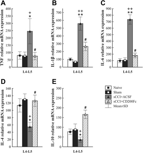 RT-PCR analysis of cytokine RNAs in the spinal cord after CD200Fc administration. Effect of CD200Fc on TNF, IL-1β, IL-6, IL-4, and IL-10 mRNAs expression in L4–L5 segments of spinal cord from sCCI-operated rats for 7 days. sCCI of the sciatic nerve and ACSF treatment increased levels of TNF (a), IL-1β (b), and IL-6 (c) as well as decreased IL-4 (d) and IL-10 (e) mRNA expression in the lumbar spinal cord segments. Intrathecal CD200Fc administration prevented the increase of TNF, IL-1β, and IL-6 as well as the decrease of IL-4 and IL-10 mRNAs expression in the lumbar spinal cord segments. The mRNA expression of each gene (n = 6 per group) was normalized to that of the 18S gene and the data represent the mean ± SD. *p < 0.05, **p < 0.001 when compared to naïve rats; +p < 0.05, ++p < 0.001 when compared to sham-operated rats; #p < 0.05 when compared to sCCI + ACSF rats. Mann-Whitney U test
