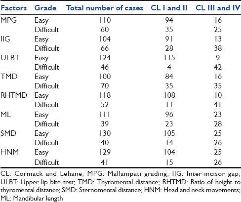 In this single blinded, prospective, observational study involving 170 adult patients of either sex belonging to American Society of Anesthesiologists physical Status I–III scheduled to undergo general anesthesia were recruited. All patients were subjected to the preoperative airway assessment and, the above parameters were recorded correlated with Cormack and Lehane grade and analyzed. The number of intubation attempts and use of intubation aids were also noted.