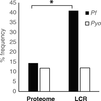 Usage of the most common amino acid (asparagine) in two species with similar AT content (Pf and Pyo). Significant (p-value < 0.001) preference for Asparagine usage in LCRs is shown by the asterisk
