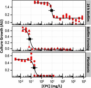 Antimicrobial activity for different culture conditions. CPC antimicrobial activity against S. mutans differs under conditions of planktonic (bottom), biofilm forming (middle), and 24 h biofilm (top) growth. Culture Growth was assessed by turbidity (for planktonic culture) or metabolic activity (for biofilm forming and 24 h biofilm cultures). Grey lines connect n = 4 replicates for each [CPC]; black traces, points, and horizontal bars show three-factor logistic fits, calculated IC50 values, and day-to-day precision, as described in the “Materials and methods” section