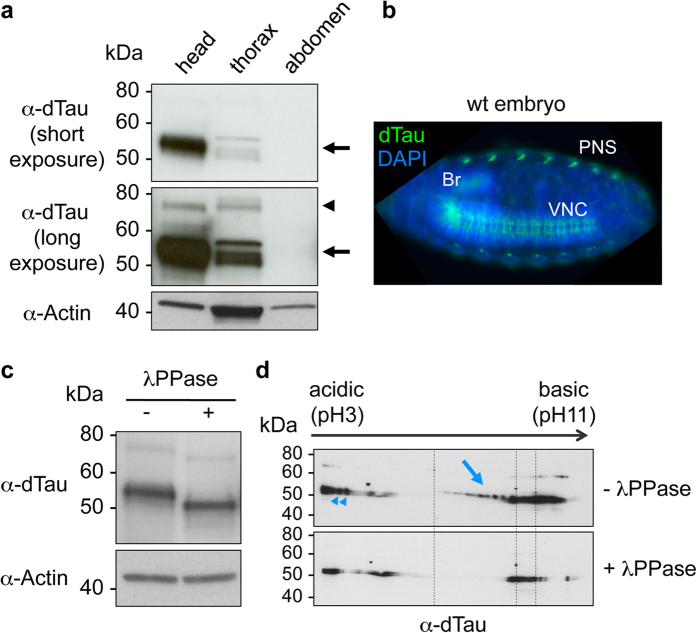 (a) Western blot analysis showed an enrichment of dTau proteins in heads and thoraces of wild-type flies, with several isoforms being detected. The major dTau isoforms migrated at an apparent MW of ±55 kDa (arrow) while a less abundant isoform, mainly detected following a long-time exposure, was detected at ±75 kDa (arrowhead). No dTau signal could be detected in extracts from fly abdomens. The Actin control confirmed the presence of proteins in all investigated samples including fly abdomens. (b) Immunofluorescence on wt Drosophila embryos showed that dTau (green) was localised in the fly nervous system (Br: brain, VNC: ventral nerve chord, PNS: peripheral nervous system). DAPI (blue) was used to stain cell nuclei. (c,d) Phosphatase treatment on fly head extracts led to a shift of dTau apparent MW for both the 55 and 75 kDa bands (c) and to the loss of several dTau-positive spots (arrow and arrowheads) as observed by 2D gel electrophoresis (d) suggesting that they corresponded to phosphorylated dTau species. Actin is shown as a loading control (c).