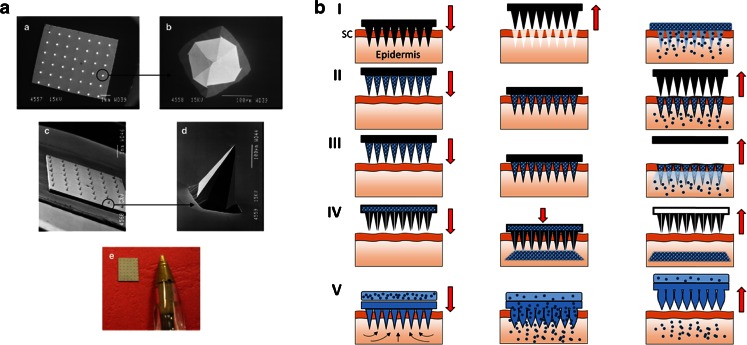 Images of a typical silicon MN arrays (a). Scanning electron microscopy (SEM) images taken of a typical silicon MN array (a–d) and a digital photograph of a typical silicon MN array (e). Schematic representation of the main MN modalities (b). Solid MNs (I); coated MNs (II); dissolving MNs (III); hollow MNs (IV) and hydrogel-forming MNs (V). Reproduced with permission from (69).