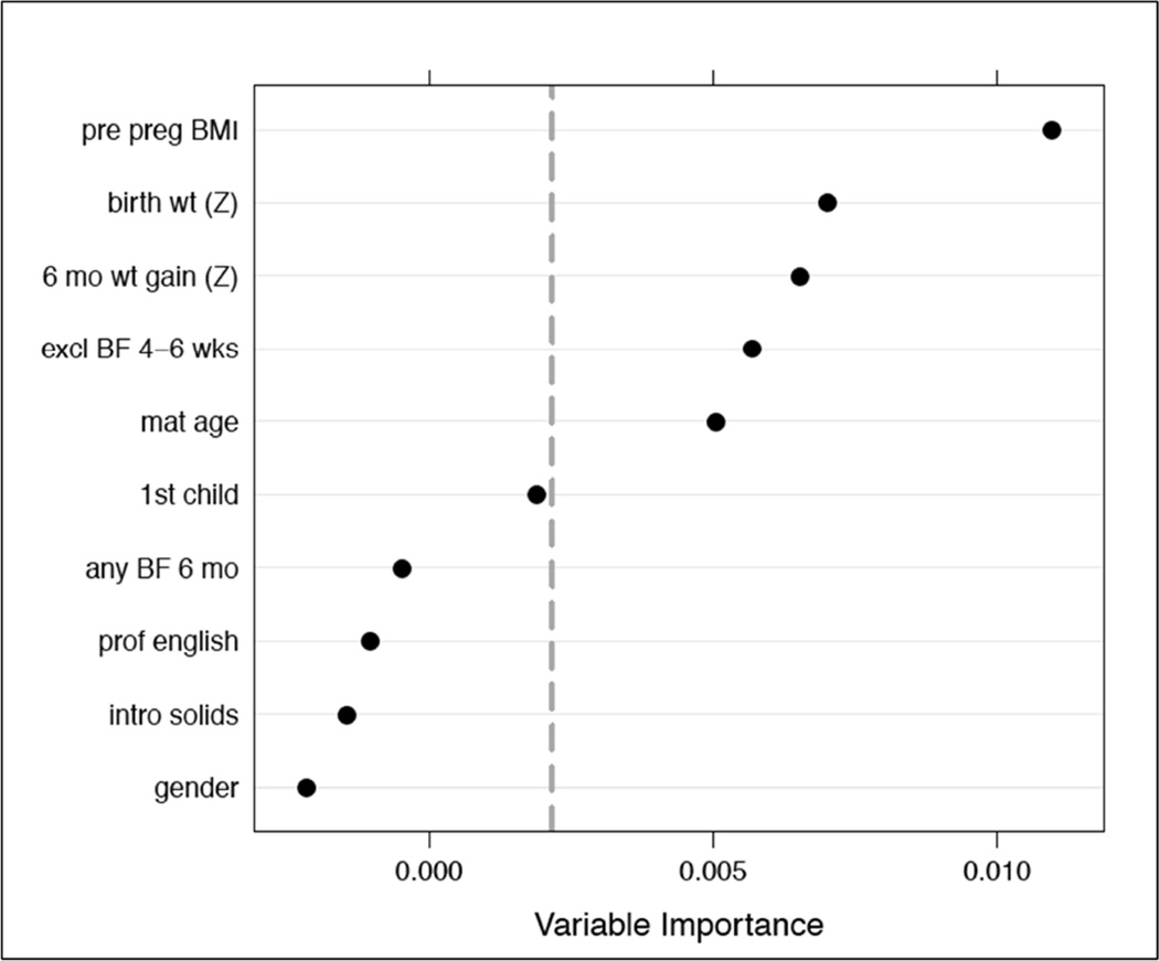 In reviewing our longitudinal data, we identified 19 candidate predictors of childhood obesity, including 11 prenatal/maternal and 8 early post-natal risk factors (Table I; available at www.jpeds.com). We applied our guiding principles in creating the predictive model, removing several maternal variables, including maternal depression, employment status and years in the United State, due to concerns over infrequent inclusion in the standard medical record and/or time burden on the HCP to document. Maternal smoking was excluded due to low prevalence of smoking in the cohort—both during pregnancy and in the first year of follow up, reported smoking prevalence was <3%. Gestational age was excluded due to co-linearity with birth weight and little independent predictive value.