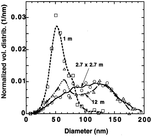 A summary of the results from four pool burns is given in Table 1. Increasing the pool size from 40 cm to 60 cm more than doubled the heat release rate and the mass loss rate of fuel, but it had a relatively minor effect on the smoke yield and in the smoke properties. The emission of smoke was high with ε about 0.10 (10 % conversion to smoke) and the mass specific extinction coefficient, KS = 9.1 m2/g, was similar to what has been observed for other soot producing fuels. Over 60 % of the smoke aerosol was in the submicrometer aerodynamic size range, which is indicative of a long atmosphere residence time and potentially high deposition in the lower respiratory tract. More details on the size distribution and optical property measurements are discussed below.