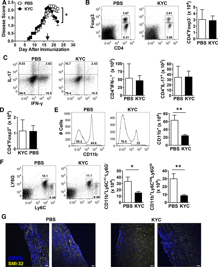 EAE was induced in C57BL/6 mice by immunization with MOG35–55 and KYC (3 mg/kg) or PBS was administered i.p. daily from days 17–21. A) The daily average ± SE EAE score from two experiments is shown. N = 6. B-F) On day 22 mononuclear cells were isolated from the CNS and the absolute number of total CD4 T cells (Foxp3−) (B), CD4+IFN-γ+ T cells (C), CD4+IL-17+ T cells (C), CD4+Foxp3+ Treg (D), CD11b+ myeloid cells (E), CD11b+Ly6C+/−Ly6G monocytes/macrophages (F) and CD11b+Ly6CintLy6G+ neutrophils (F) were determined by flow cytometry. Data shown are the mean ± SE from two experiments using the mice from A. Representative dots plots showing gating strategies for CD4 T cells (B) expressing Foxp3 (B) or IL-17 and IFN-γ (C) and CD11b+ myeloid cells (E) expressing Ly6C and Ly6G (F) are shown. G) Longitudinal frozen sections from the spinal cord of mice on day 22 were generated from PBS (top panels) and KYC (bottom panels) treated mice. The sections were stained with anti-CD11b (blue) and SMI-32 (yellow) and analyzed by immunofluorescence. Overlaid images are shown. Data shown are representative images from two mice of three. Scale bar, 40 µM. *p<0.05, **p<0.01, determined by the unpaired t-test.