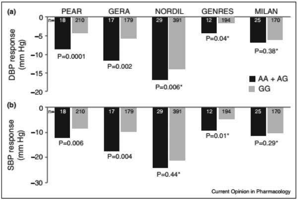 NEDD4L is known to encode a ubiquitin ligase enzyme that interferes with sodium excretion in the kidneys via reducing the renal tubular expression of epithelial sodium channel (ENAC) [26]. In knockout mouse models, NEDD4L has been associated with higher levels of ENaC expression, and salt-sensitive HTN [27]. A common synonymous single nucleotide polymorphism (SNP) within NEDD4L, rs4149601G>A, has been reported as an important predictor of HTN, salt sensitivity, and TZD-BP response [28–30,31•]. This SNP causes alternative splicing, which was associated with A-allele carriers having down-regulated ENaC expression compared to G-allele carriers [32]. In consequence, one would expect that individuals carrying the G-allele of rs4149601 would respond better to TZDs because they would have higher ENaC expression, and more salt sensitivity. Data from the NORDIL (Nordic Diltiazem) study were able to confirm this hypothesis and demonstrated that European Americans (Whites) G-allele carriers treated with either a TZD diuretic or a β-blocker, for 6 months, had better SBP and DBP reduction compared to AA carriers in both groups (SBP: −19.5 ± 16.8 versus −15.0 ± 19.3 mmHg, P < 0.001, DBP: −15.4 ± 8.3 versus −14.1 ± 8.4, P = 0.02, respectively) [33]. This signal was further confirmed to be a TZD specific signal by replicating it in Whites treated with a TZD diuretic for 9 weeks in the Pharmacogenetic Evaluation of Antihypertensive Responses (PEAR) study [34••] (Figure 2). On the contrary, no association was observed between rs4149601 and β-blocker treated patients within PEAR Whites or diltiazem treated White patients within NORDIL, suggesting that this SNP is specially influencing response to TZDs. This is not surprising given that ENaC is central to the diuretic effects of TZDs.