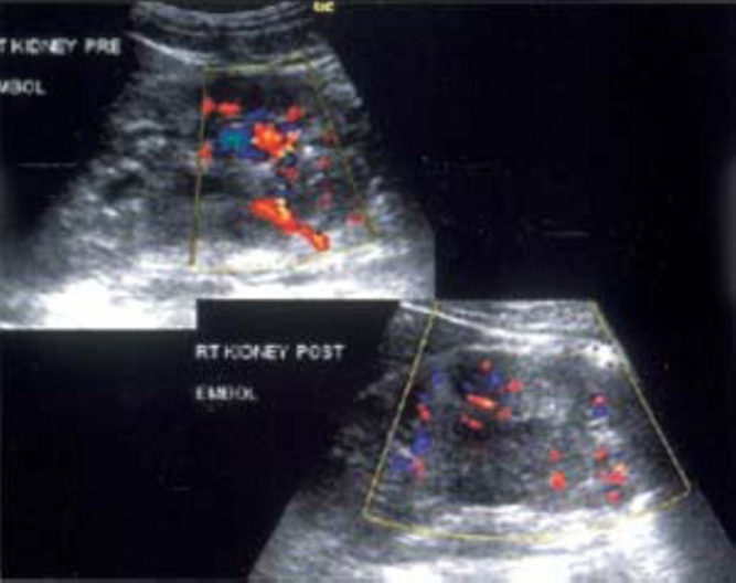 Color doppler of right kidney in an adult male presenting with recurrent hematuria following PCNL shows pseudoaneurysm. Post embolisation color doppler images reveal obliteration with regression in size.
