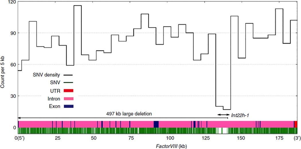 Single-nucleotide variation (SNV) density plot for F8. All SNVs (2981 SNVs within F8 are shown) are plotted onto the F8 gene (green). The SNV density (black) is calculated by counting the number of variants in the 5 kb sliding window. The F8 exons are represented in navy blue and the introns are in pink, the 5′ UTR and 3′ UTR are labeled in red (5′ UTR is 171 bp and masked by the first exon). The int22h-1 region and the part of the large deletion in F8 are labeled with arrows.