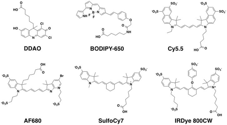 Published dye structures used in this study including cyanine-based structures, boron-dipyrromethene (BODIPY), and the acridine-based (7-hydroxy-9H-(1,3-dichloro-9,9-dimethylacridin-2-one)) dye DDAO. These structures represent the hydrolyzed NHS ester form of the dyes.