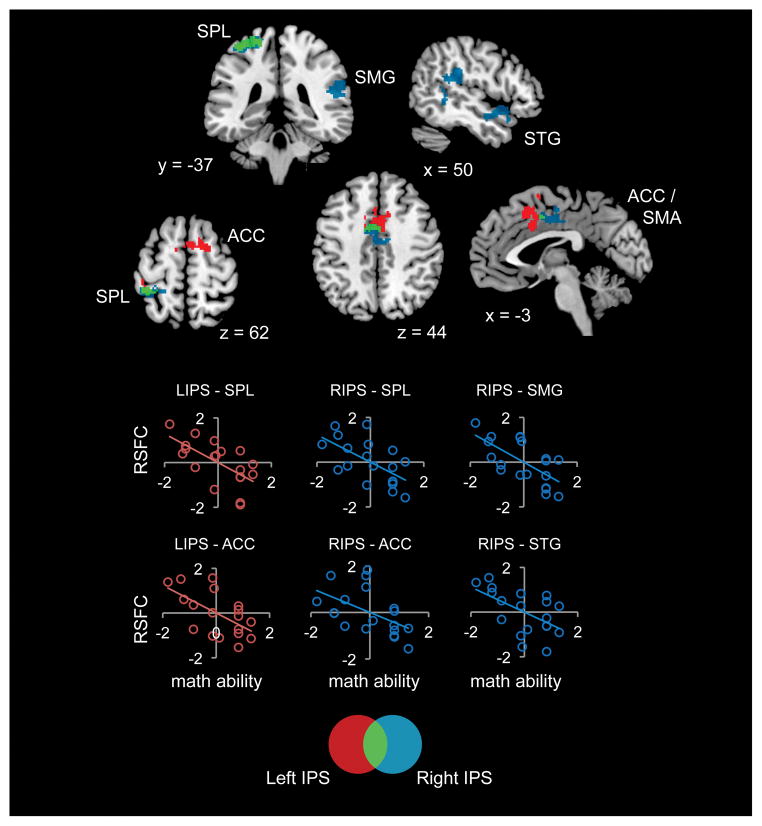 There is growing evidence to suggest that numerical cognition relies on interactions within and between multiple functional brain systems, including those subserving quantity processing, episodic and semantic memory, working memory, and cognitive control (e.g., Arsalidou & Taylor, 2011; Fias et al., 2014; Figure 1). While the IPS plays a key role in building representations of numerical quantity, it is also part of an intrinsically connected dorsal fronto-parietal system that includes the superior parietal lobe (SPL), frontal eye fields, supplementary motor area (SMA), insula, and middle frontal gyrus (MFG) (Corbetta, Patel, & Shulman, 2008; Corbetta & Shulman, 2002; Menon & Uddin, 2010; Supekar & Menon, 2012; Uddin et al., 2010). This system is thought to be important for top-down goal-driven attention, including performance monitoring and manipulation of numerical information in working memory. In contrast, the ventral attention system, which includes the supramarginal gyrus (SMG), insula and inferior frontal gyrus, is thought to be involved in saliency processing and attentional filtering (Corbetta et al., 2008; Corbetta & Shulman, 2002; Fox, Corbetta, Snyder, Vincent, & Raichle, 2006; Menon & Uddin, 2010; Supekar & Menon, 2012). Finally, memory systems anchored in the medial and anterior temporal lobe, as well as in the angular gyrus, are important for encoding and retrieval of math facts (Grabner et al., 2009; Qin, Cho, et al., 2014). It is currently not known whether functional circuits associated with the IPS are aberrant in MD and crucially, whether they impact the multiple dorsal and ventral fronto-parietal and memory circuits that are involved in numerical cognition.