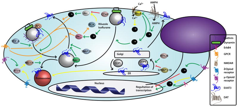 For decades, alterations in the glutamatergic neurotransmission have been associated with schizophrenia (Hu et al., 2015), where decreased expression of EAAT2 was described first (Ohnuma et al., 1998), and decreased EAAT3 expression in striatum was described 4 years later for both schizophrenic and bipolar patients (McCullumsmith and Meador-Woodruff, 2002). While a study reported no changes in EAAT3 mRNA expression in the thalamus of schizophrenia patients (Smith et al., 2001), it was later shown that there was an increase in expression of JWA, the human ortholog of rat GTRAP3-18, in the thalamus (Huerta et al., 2006). Since GTRAP3-18 is known to regulate EAAT3 by means other than transcription/translation (Liu et al., 2008, Aoyama and Nakaki, 2012) (see below for a discussion of the mechanism of GTRAP1-18), altered EAAT3 function might be a contributing factor in the thalamus as well. In the caudate nucleus of schizophrenia patients, EAAT3 protein was decreased (Nudmamud-Thanoi et al., 2007). The cortex showed an increase in EAAT3 (Rao et al., 2012), where increased JWA was also observed (Bauer et al., 2008). A mutation in phosphatidylinositol-4-phosphate 5-kinase II alpha found only in schizophrenia patients displays a dominant negative effect on EAAT3-mediated Glu currents in oocytes. (Fedorenko et al., 2009). These studies implicate EAAT3 in schizophrenia, where they primarily suggest a regulatory change of the EAAT3 membrane targeting or function.