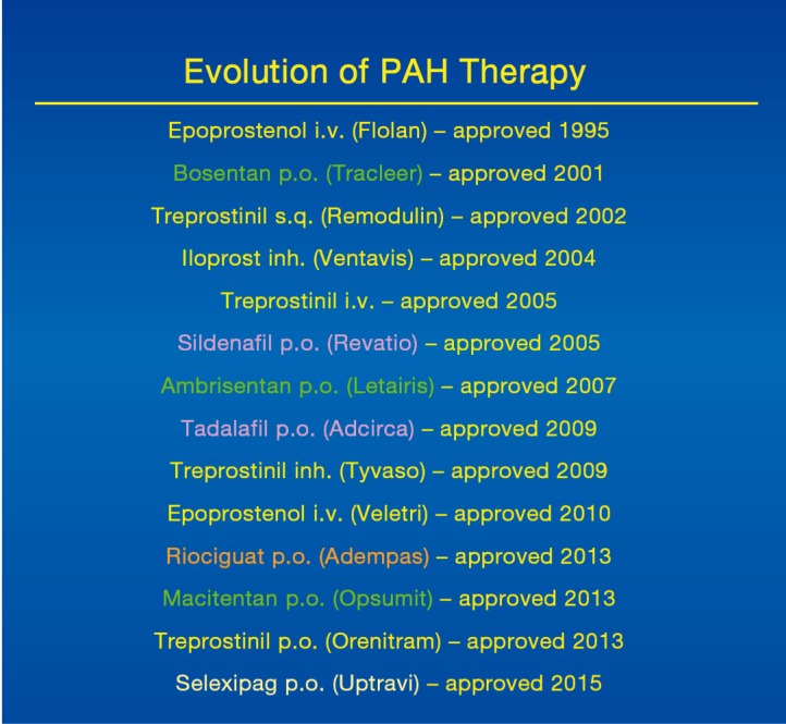 Chronologic list of PAH therapies and their dates of FDA approval (6). PAH, pulmonary arterial hypertension; FDA, Food and Drug Administration.