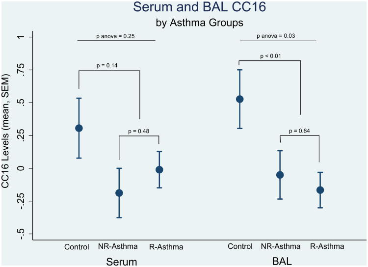 Assessing airway CC16 in asthma is important because it may provide insights into whether CC16 deficits in serum from asthmatics can be explained by reduced airway CC16 production. We sought to compare CC16 levels in serum and BAL from patients with refractory asthma, non-refractory asthma, and controls.