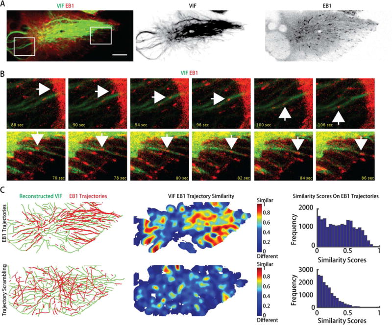 To further test the notion that VIF act, at least in part, as a template for microtubule growth we analyzed the spatial correlation of VIF with trajectories of the microtubule-plus tip associated protein EB1 in RPE cells (Figure 4A, Movie S7). EB1 comets are observed to systematically move along VIF (Figure 4B, Movies S8, S9). To statistically demonstrate guidance of EB1 trajectories by VIF, we reconstructed EB1 trajectories using plusTipTracker software (Applegate et al., 2011; Matov et al., 2011) and calculated the similarity of the trajectory network with the VIF network (Figure 4C). We then scrambled the location and orientation of EB1 trajectories within the cell boundary and found that similarity scores along scrambled trajectories are much lower than along the measured trajectories (Figure 4C). This analysis supports the conclusion that microtubule growth is guided by the VIF network.