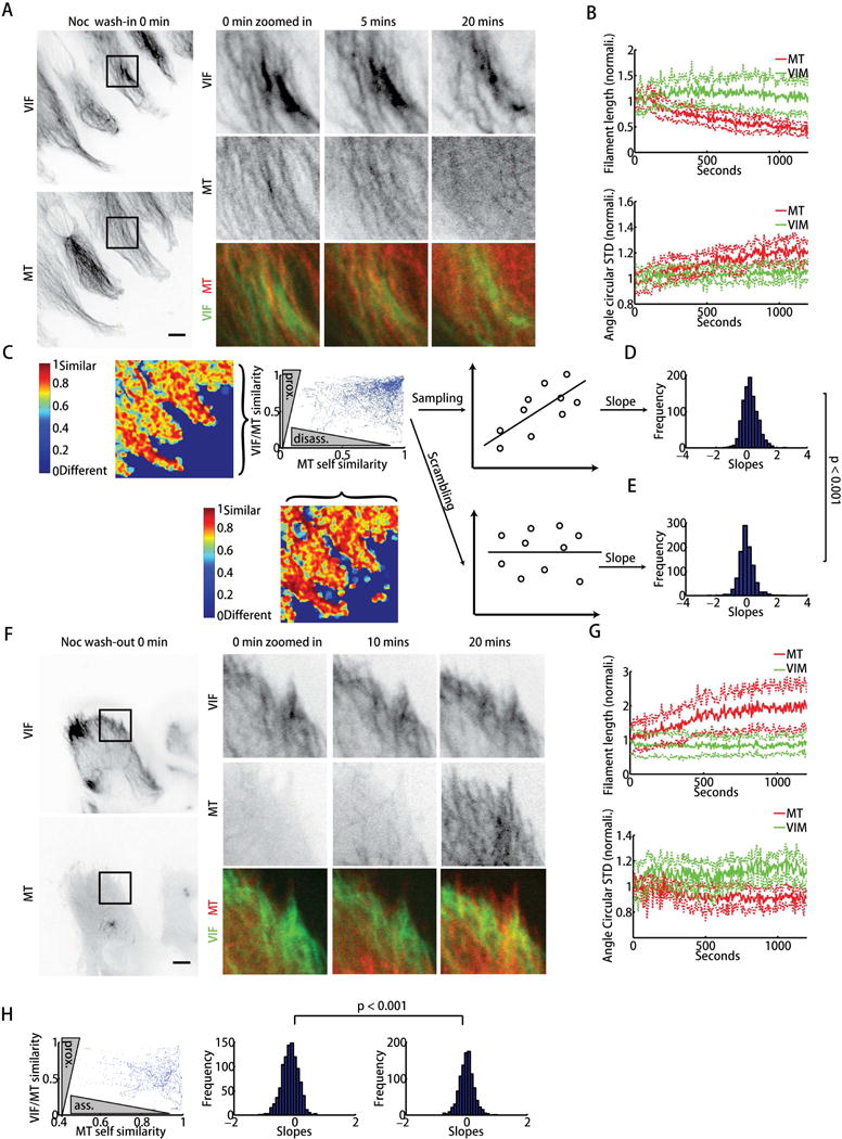 VIF stabilizes MTs and guides MT re-growth. (A) Confluent RPE cell monolayers were scratched, incubated with nocodazole and imaged. Top, bottom, representative images of mEmerald-vimentin and mTagRFPt-α-tubulin at different time points as indicated (Movie S3). t = 0 indicates time point of nocodazole addition to the medium. Scale bar: 10 μm. (B) Time courses of mean normalized filament lengths and circular standard deviations of orientation from n = 7 live experiments; solid lines: mean of total (normalized) filament lengths and circular standard deviations; dotted lines represent the 95% confidence interval about mean. (C) Scatter plot of VIF/MT network similarity (higher similarity means higher proximity and alignment of the two networks) 4 minutes after nocodazole addition vs. MT self-similarity (lower self-similarity means more disassembly) between 4–5 minutes after nocodazole addition. (D) 10 data points were randomly sampled in C to determine the correlation (slope of fit line) between the two similarity score sets. Distribution of slopes calculated from 1000 sampling repeats. (E) 10 data points were randomly sampled in C and scrambled to determine the distribution of random slopes. The distributions in E and F were compared by the Kolmogorov -Smirnov test (p < 0.001). (F) Confluent RPE monolayers were scratched and incubated with nocodazole for 20 minutes and then washed out. Top, bottom, representative images of mEmerald-vimentin and mTagRFPt-α-tubulin at different time points after nocodazole wash-out as indicated (Movie S5). t = 0 indicates time point of nocodazole wash-out. Scale bar: 10 μm. (G) Time courses of the mean normalized filament lengths and circular standard deviations of orientation distribution from n = 7 live experiments; solid lines: mean of total (normalized) filament lengths and circular standard deviations; dotted lines represent 95% confidence interval about mean. (H) Scatter plot of VIF/MT network similarity 5 minutes after nocodazole wash-out vs MT self-similarity (lower self-similarity means more assembly) between 4–5 minutes after nocodazole wash-out. The distribution of slopes obtained from 1000 line fits to independent samplings of 10 data points and the slope distribution of 1000 scrambled samples. The two distributions were compared by the Kolmogorov -Smirnov test (p < 0.001).