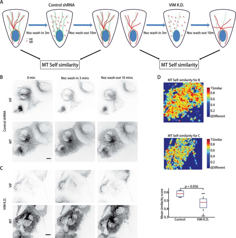 Finally, we directly asked whether the VIF network is a causal factor of microtubule organization in a migrating cell. Our proposed model of VIF’s role as a template for microtubule organization on a time scale of 10–20 minutes predicts that the microtubule networks before and after nocodazole-mediated disassembly would be more similar in a cell expressing vimentin than a cell devoid of vimentin. To test this, we used shRNA to knockdown vimentin in genome-edited RPE cells (Figure S3E–F). Indeed, we found that in cells with vimentin depletion the microtubule networks imaged before wash-in of nocodazole and again imaged after wash-out were less similar than in control cells (Figure 5A–C, Movies S10–11).